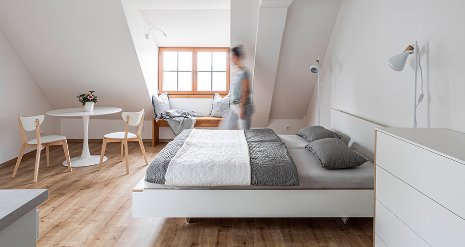 Ca. 32 m², Doppelbett, WC/Dusche, kleine Küchenzeile mit Herd, Geschirrspülmaschine, Kühlschrank und Mikrowelle, Smart-TV, Tisch mit zwei Stühlen, Schrank, gemütliches Lesefenster mit Sitzbank in der Dachgaube und schönem Blick auf den Bodensee und den Bodanrück sowie, bei schönem Wetter, auch auf die dahinterliegenden Schweizer Alpen.